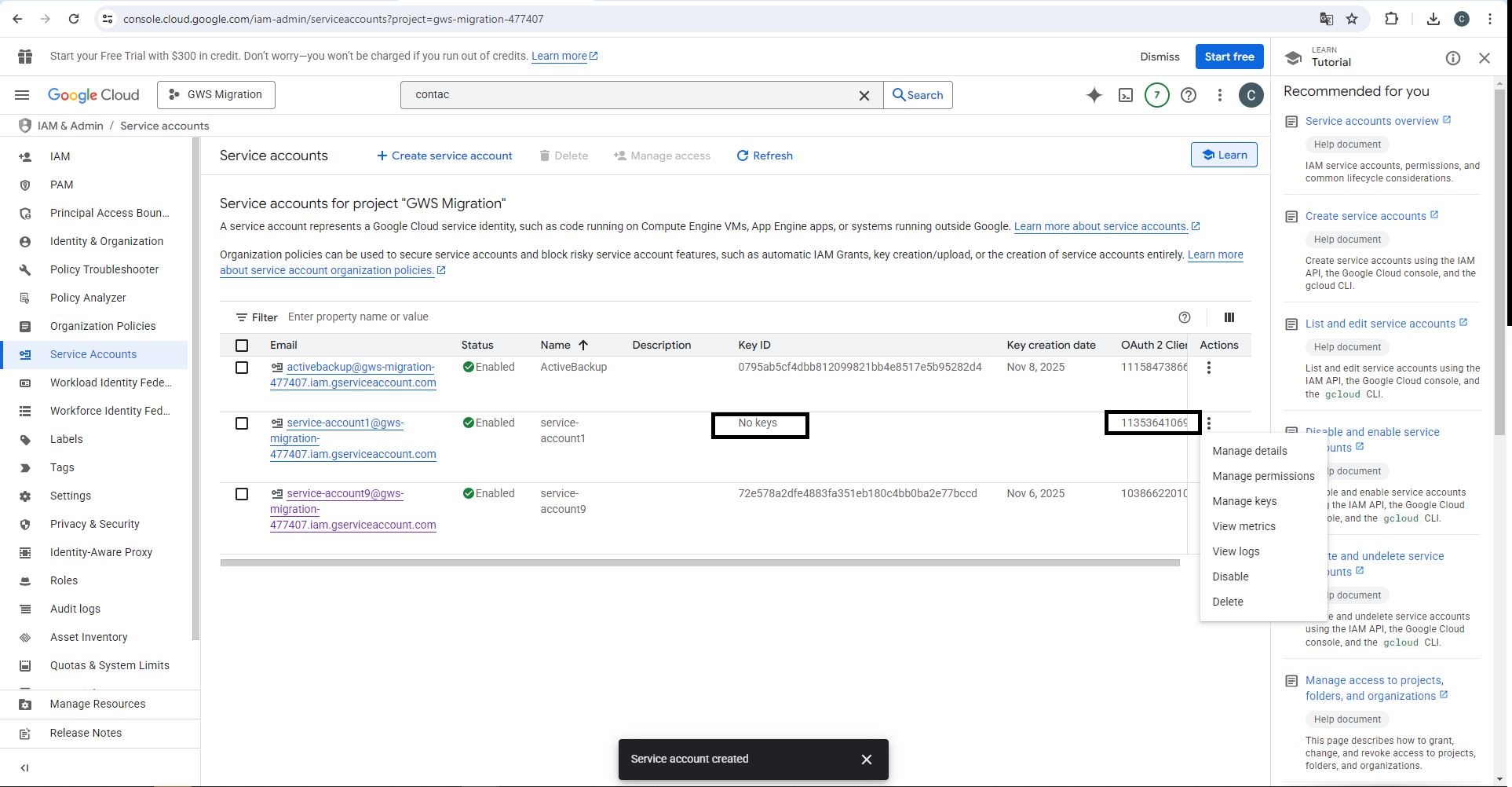 Artık servis hesabınız hazır ve sonraki adım olan JSON anahtar dosyasını oluşturma ve domain-wide delegation için kullanıma hazır.