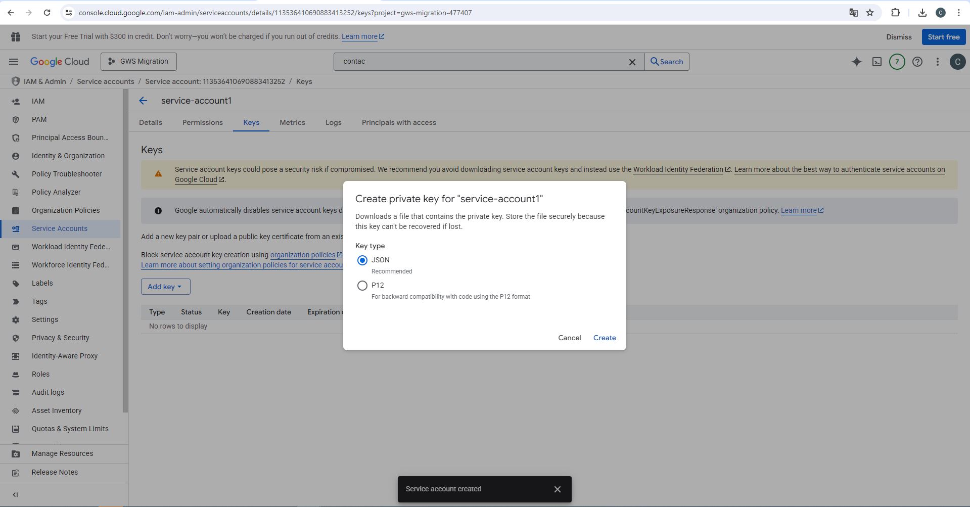 Key Type olarak JSON seçin ve Create butonuna tıklayın.