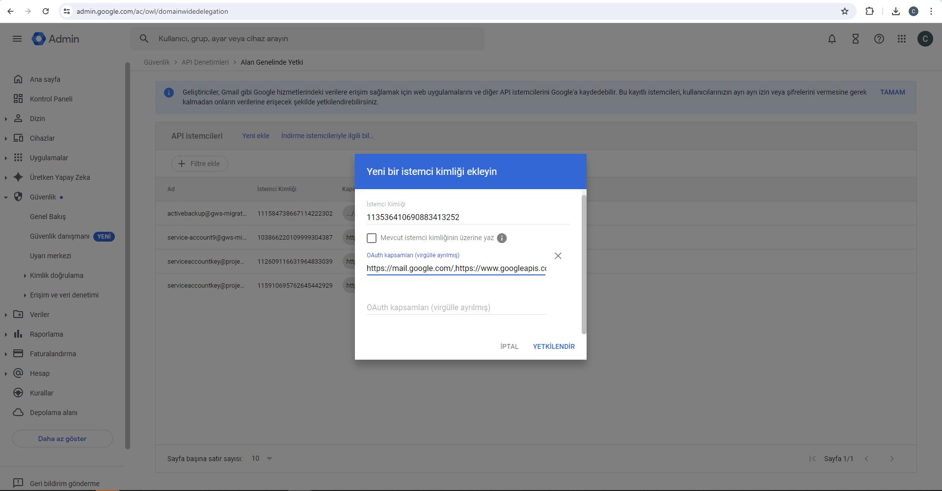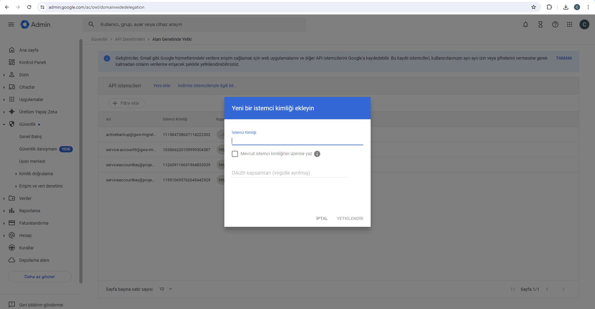 Daha önce servis hesabı oluştururken not aldığınız OAuth 2 Client ID’yi buraya girin.