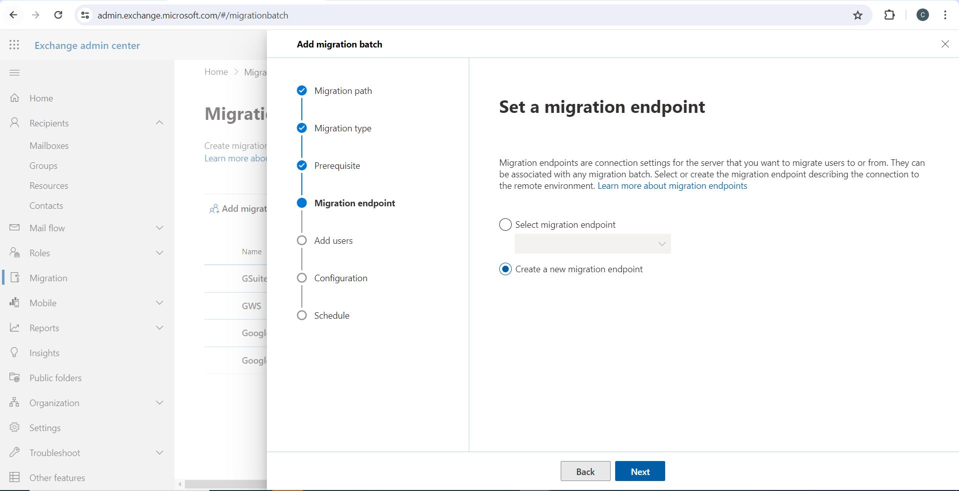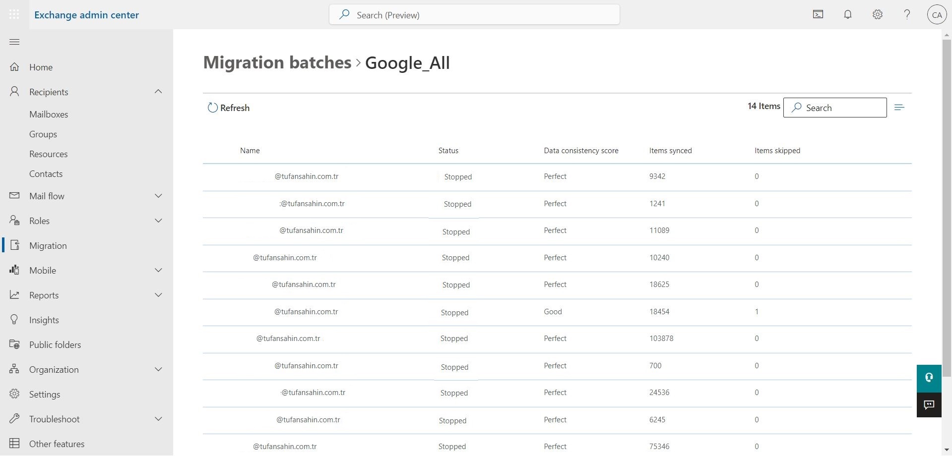 Microsoft 365 tarafındaki Exchange Admin Center’da artık migration batch oluşturma aşamasına geldik. Bu işlem, kullanıcıların mail, takvim ve kişi verilerini Google Workspace’ten Office 365’e taşımamızı sağlar.