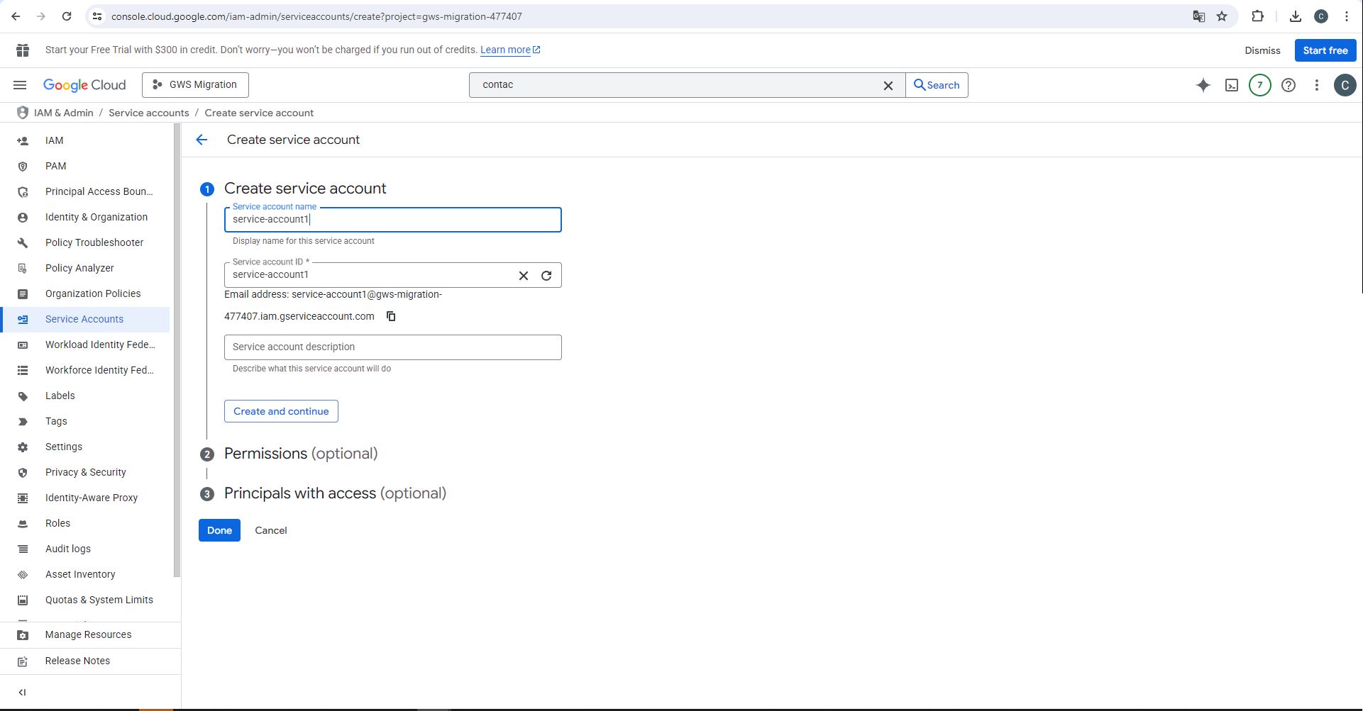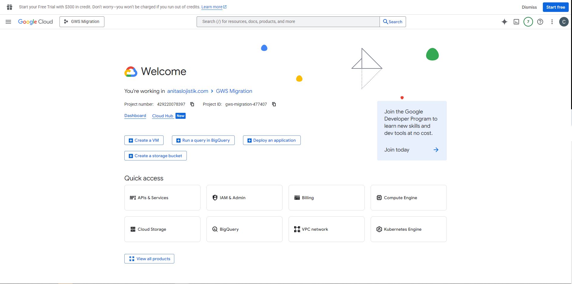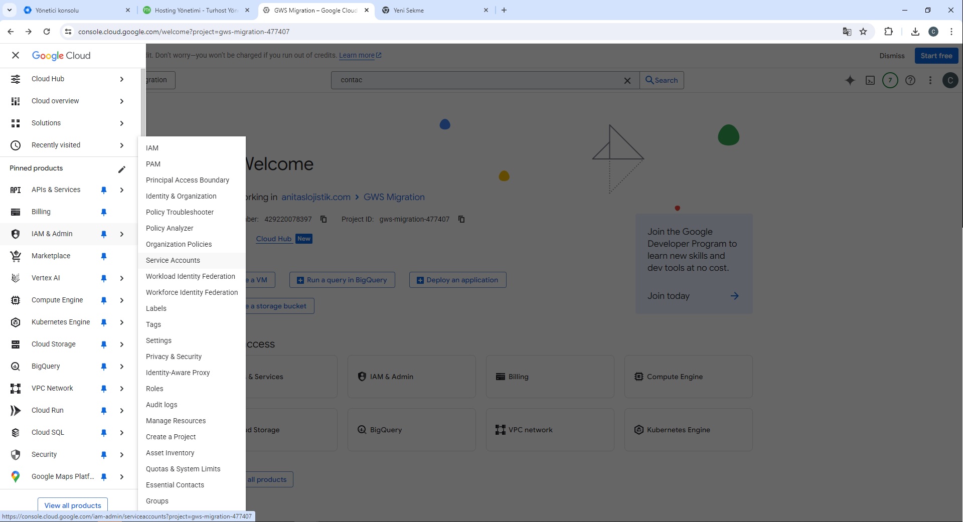 Yeni projeyi açtıktan sonra, Google Workspace ile Microsoft 365 arasında veri taşımak için Service Account (Servis Hesabı) oluşturuyoruz. Bu hesap, API erişimi ve domain-wide yetkilendirme için kullanılacak.