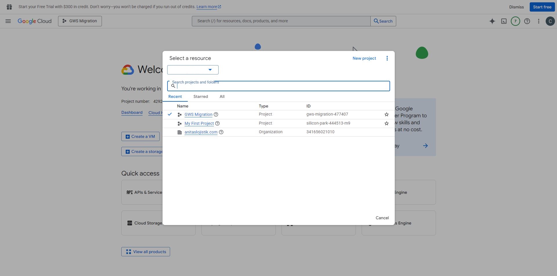 Google Cloud Console sayfasının sol üst bölümde bulunan “Project selector” menüsüne tıklayın.