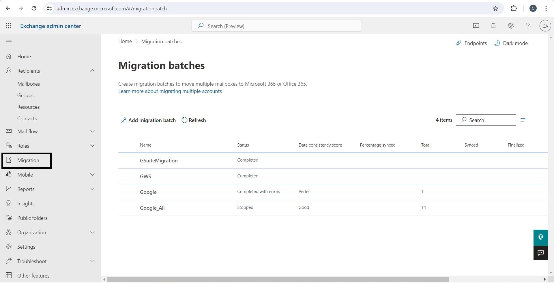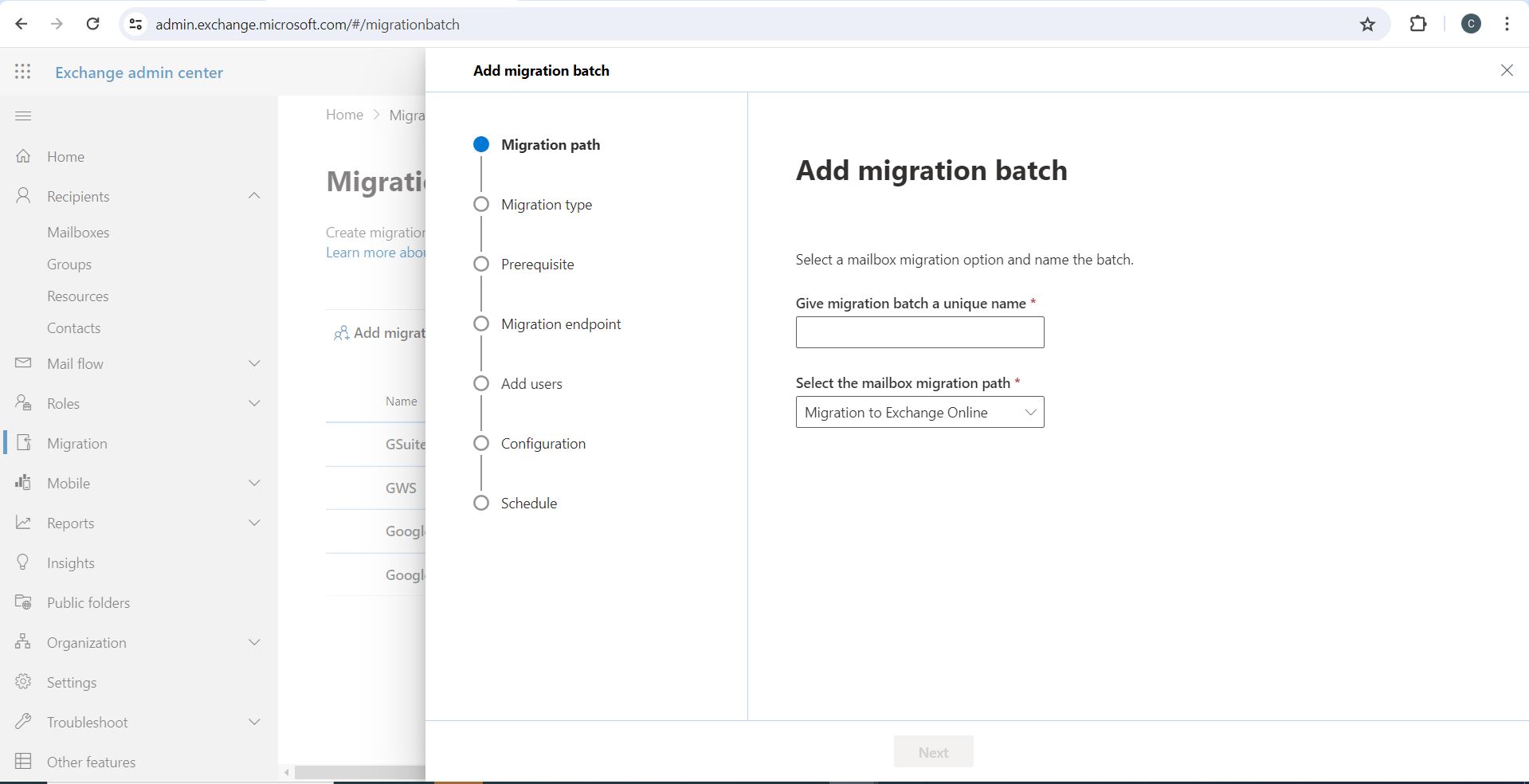Exchange Admin Center → Migration → Add Migration Batch seçeneğine tıklayın.