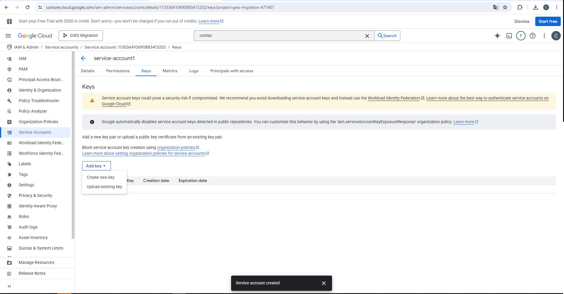 Servis hesabı oluşturulduktan sonra, migration işlemi için iki kritik bilgiye ihtiyacımız olacak: OAuth 2 Client ID ve JSON anahtar dosyası.
