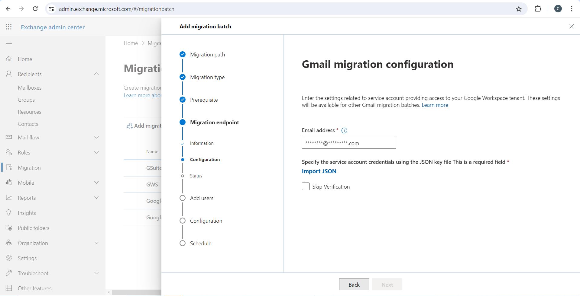 Migration endpoint oluştururken sizden GWS admin maili ve daha önce indirdiğiniz JSON dosyası istenir.